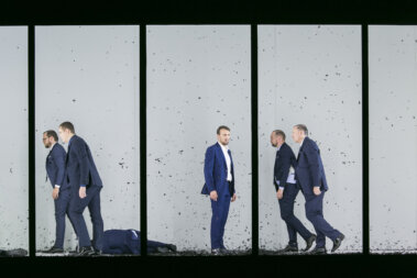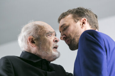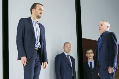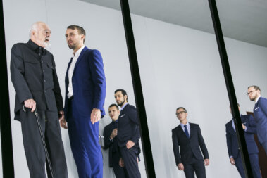 Slavné, až notoricky známé Sofoklovo drama o králi, který při pátrání po vrahovi odhalil vlastní vinu, pochází z 5. stol. př. n. l., v režii slovinské režisérky Mateji Koležnik však působí, jako by bylo napsáno včera. Její svižná, chladně elegantní a překvapivě aktuální inscenace tematizuje moc, způsob jakým ji lze získat, udržet a nakonec také ztratit. Staví přitom na moderní scénografii, smyslu pro téměř filmový detail a vynikajících hereckých výkonech. Představitel Krále Oidipa Thomas Lettow získal za ztvárnění této role cenu Bayerische Kunstföderpreus 2016.